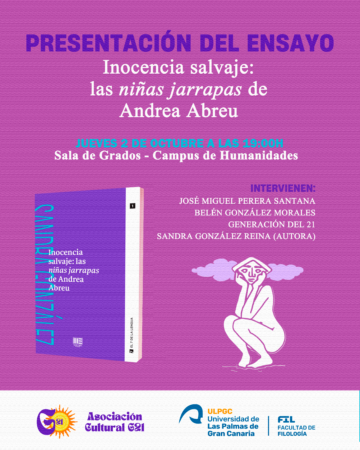 El resultado fue el que se presentó en la Sala de Grados del Campus de Humanidades (o del Obelisco): Inocencia salvaje: las niñas jarrapas de Andrea Abreu. Libro y autora estuvieron muy bien acompañados por nuestra profesora Belén González Morales; por José Miguel Perera Santana, que no es nada ajeno a nuestra casa y, por supuesto, Generación del 21, que interpretaron algunas de las canciones que aparecen en la novela y, como consecuencia, en el ensayo.